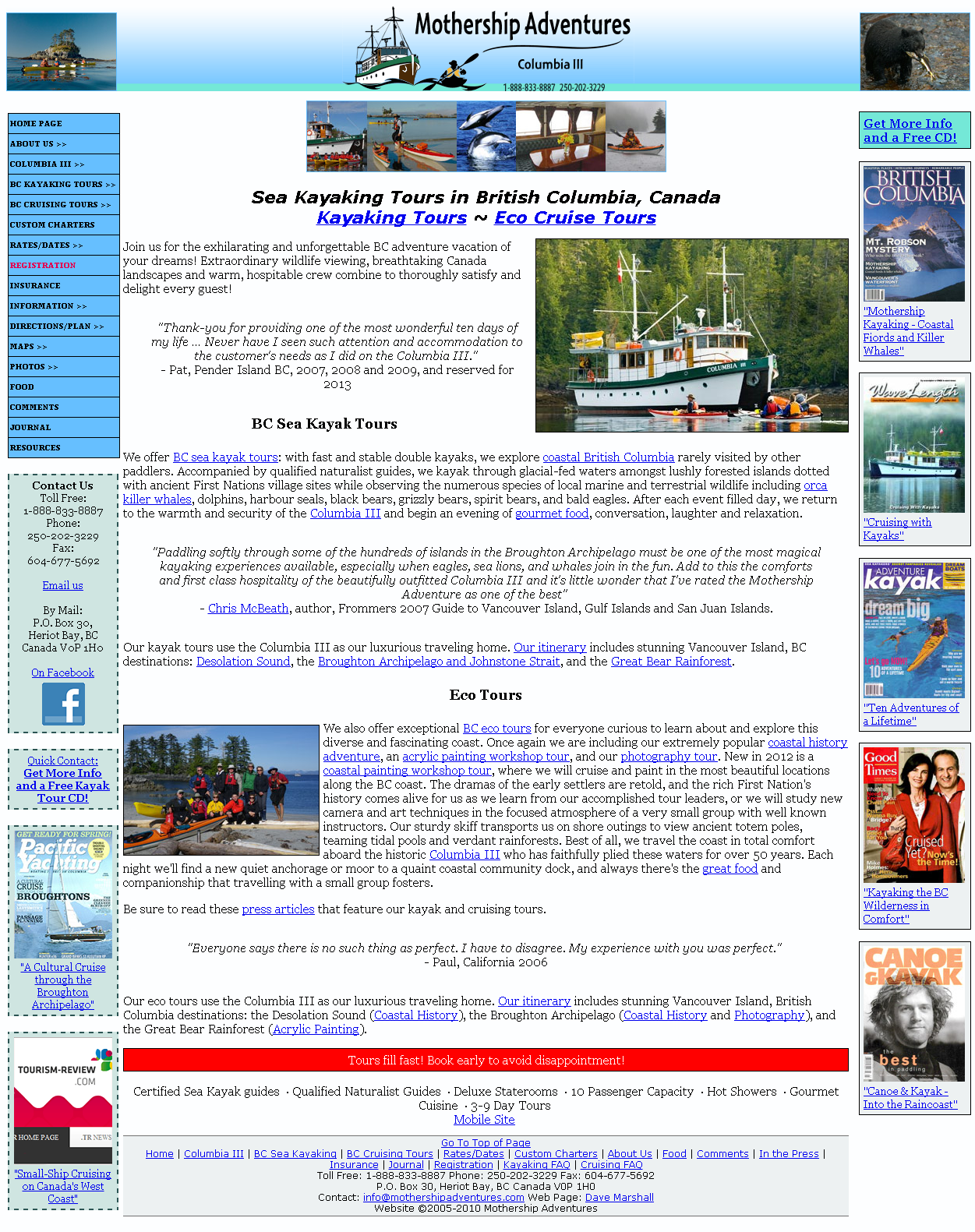 Mothership Adventures and Columbia III were sold in the early 2000s to a Seattle owner who intended continuing the business in BC waters. However, he couldn’t make his way around the Canadian 60-ton master’s ticket requirement for Columbia III. Meanwhile Ross Campbell and Fern Kornelsen, who had fallen short in their attempts to buy Mothership Adventures from Bill McKechnie, continued to make it abundantly clear to the US owner that, if he wanted to sell, they would buy. They became owners in early 2005.