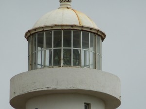 There are two birds perched on the tower. One on the finial on top and the other on the side of the lantern room drying his wings. They are likely the local vulture (Urubu) or cormorants, it’s hard to tell from here. The stick and angled down lead are lightning protection. There used to be a keepers house made of brick just inside the concrete wall but it now flattened on its side and not much good for living in.